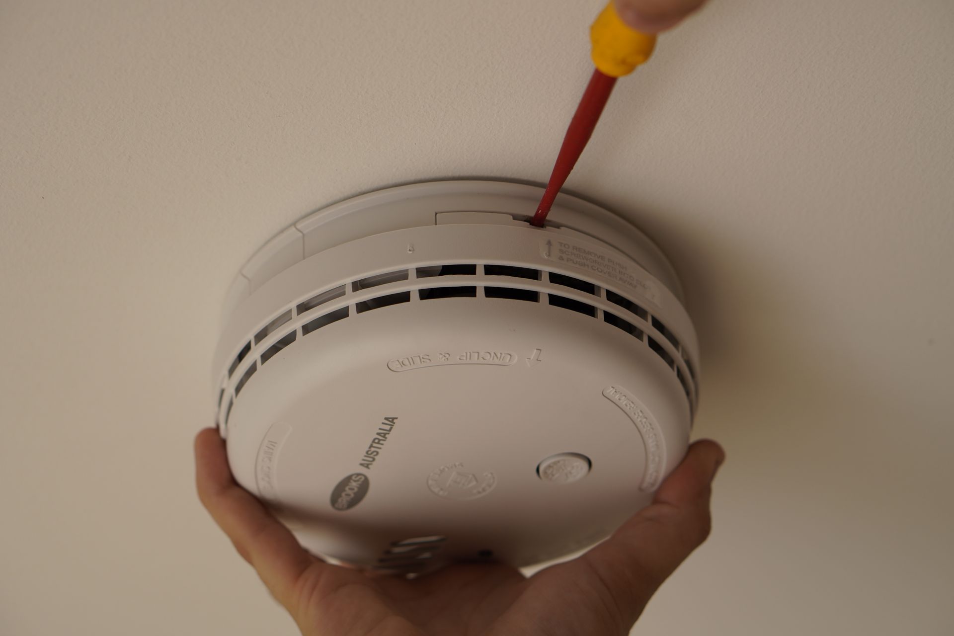 To access the battery compartment, you’ll need to remove the alarm from its base. Most smoke alarms in Australia either hinge down, twist off anti-clockwise, or slide off in the direction of an arrow. Some models may require a screwdriver to release a clip before sliding free.